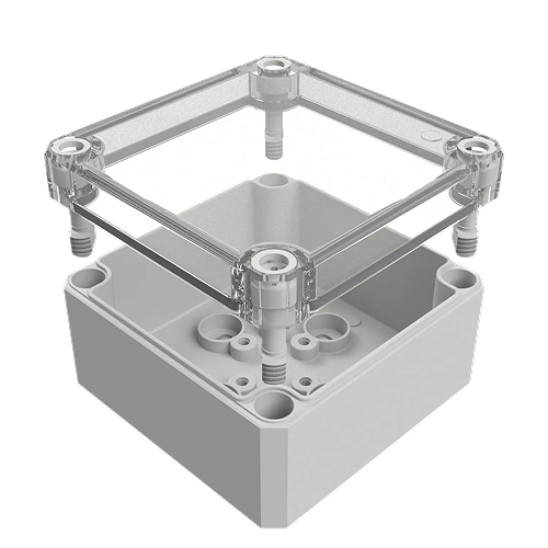 Корпус пустой, гладкие стенки, прозрачная крышка, размеры:94*94*57, поликарбонат GF10, IP66, UV-устойчивый, без галогенов и силикона, светло-серый (RAL7035), рабочая температура -40...100°C, полиуретановое уплотнение, невыпадающие пластиковые винты, подходит для использования в помещении и на открытом воздухе, вес - 0,17 кг.