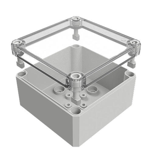 Корпус пустой, гладкие стенки, прозрачная крышка, размеры:110*110*66, поликарбонат GF10, IP66, UV-устойчивый, без галогенов и силикона, светло-серый (RAL7035), рабочая температура -40...100°C, полиуретановое уплотнение, невыпадающие пластиковые винты, подходит для использования в помещении и на открытом воздухе, вес - 0,23 кг.