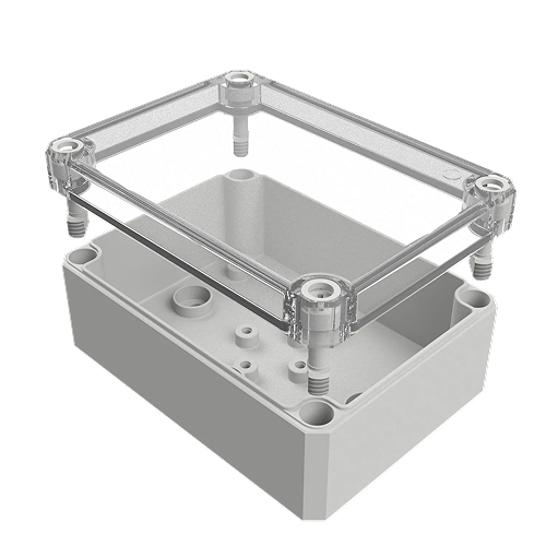 Корпус пустой, гладкие стенки, прозрачная крышка, размеры:130*94*57, поликарбонат GF10, IP66, UV-устойчивый, без галогенов и силикона, светло-серый (RAL7035), рабочая температура -40...100°C, полиуретановое уплотнение, невыпадающие пластиковые винты, подходит для использования в помещении и на открытом воздухе, вес - 0,21 кг.