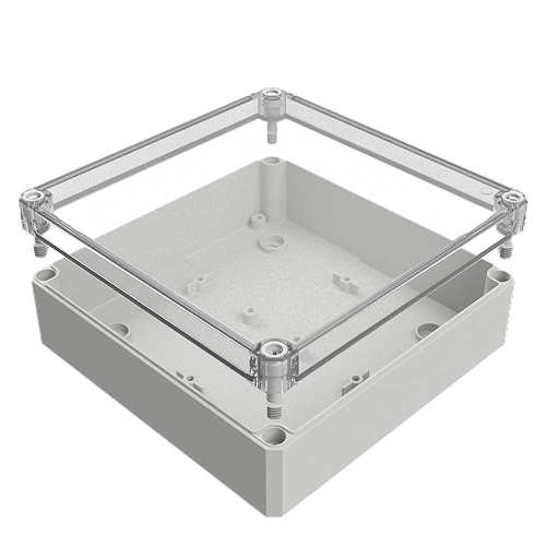 Корпус пустой, гладкие стенки, прозрачная крышка, размеры:182*180*63, поликарбонат GF10, IP66, UV-устойчивый, без галогенов и силикона, светло-серый (RAL7035), рабочая температура -40...100°C, полиуретановое уплотнение, невыпадающие пластиковые винты, подходит для использования в помещении и на открытом воздухе, вес - 0,47 кг.