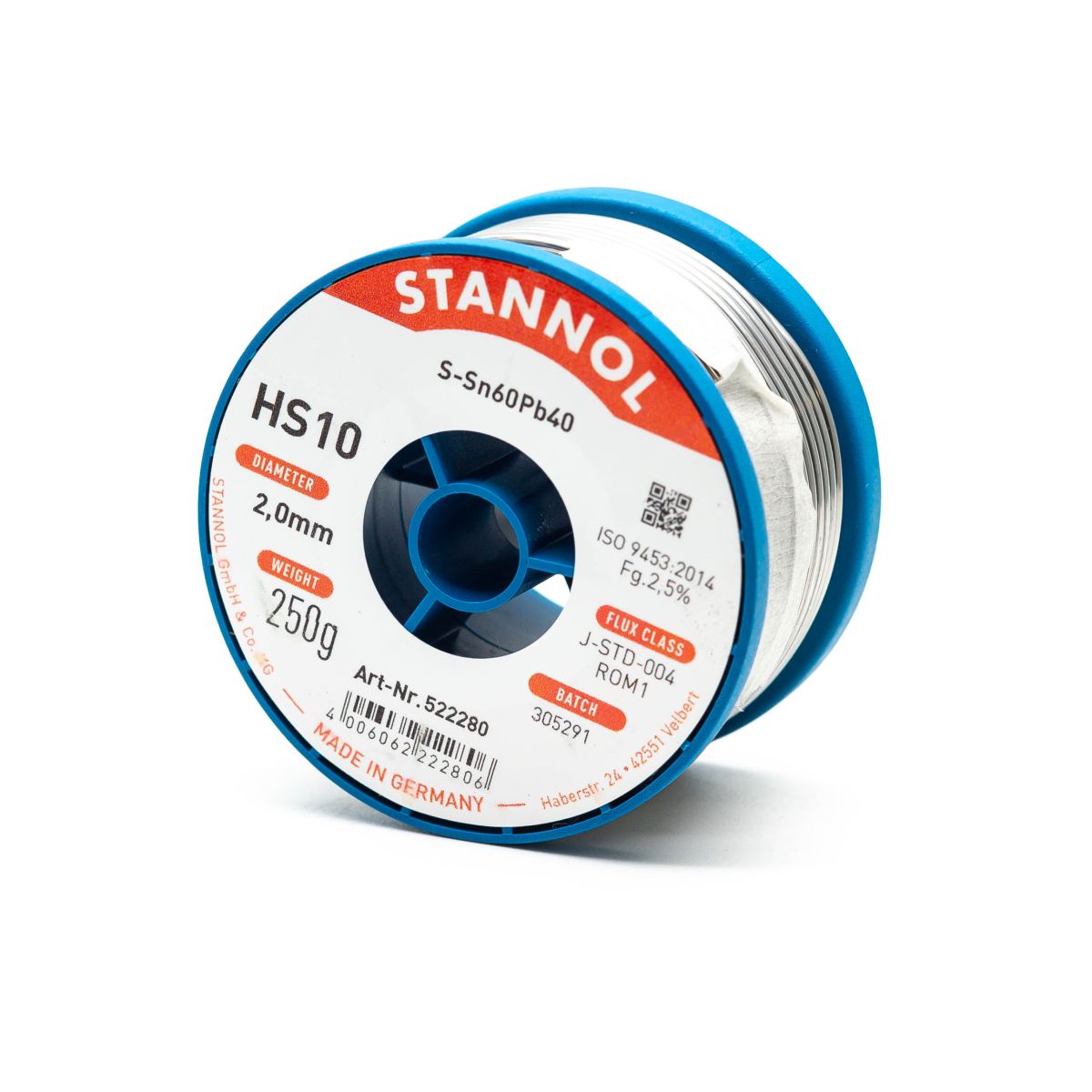 Трубчатый припой Stannol HS10 2.0 мм 522280 катушка 250 гр. – трубчатый припой с флюсом на основе канифоли, активированной соединениями галогенов. Характеризуется хорошей смачивающей способностью, обеспечивает быстрое растекание, остатки не электропроводны. Содержание флюса – 2.5%. Допускается возможность оставлять остатки флюса. Трубчатый припой с флюсом HS10 - проверенный и надёжный продукт компании STANNOL, который отвечает высоким требованиям качества как в области производства электроники, так и при проведении сервисного обслуживания приборов. Трубчатый припой STANNOL HS10 содержит эффективный активированный флюс. В результате припой обеспечивает быстрое растекание и электрическую безопасность остатков. Данный флюс является канифольным, и содержит соединения галогенов.